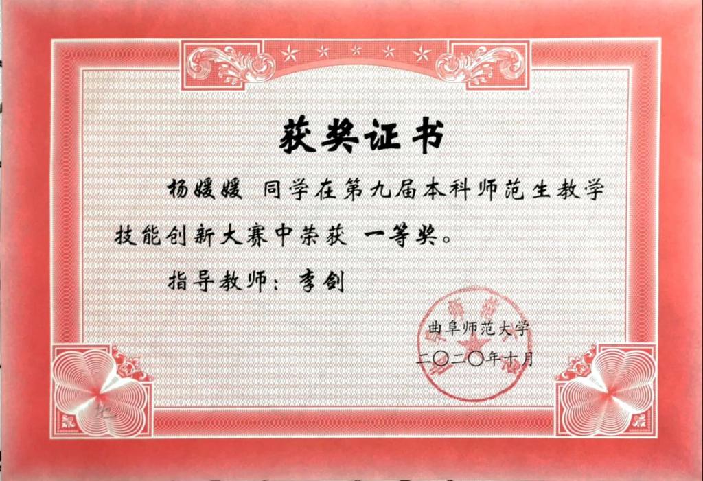 师范生教学技能创新大赛第一名。