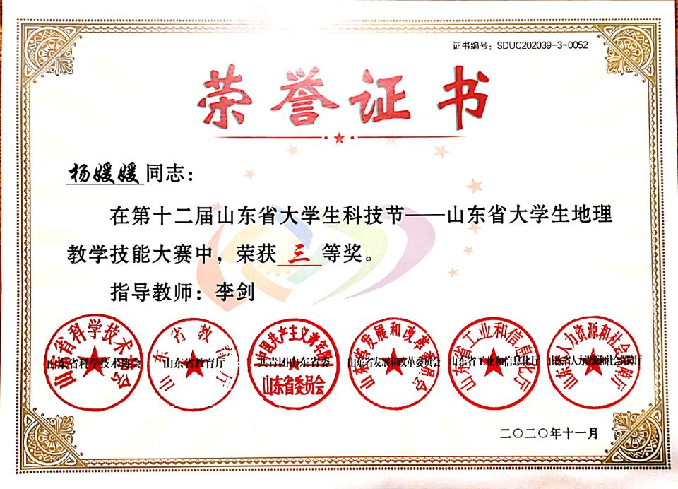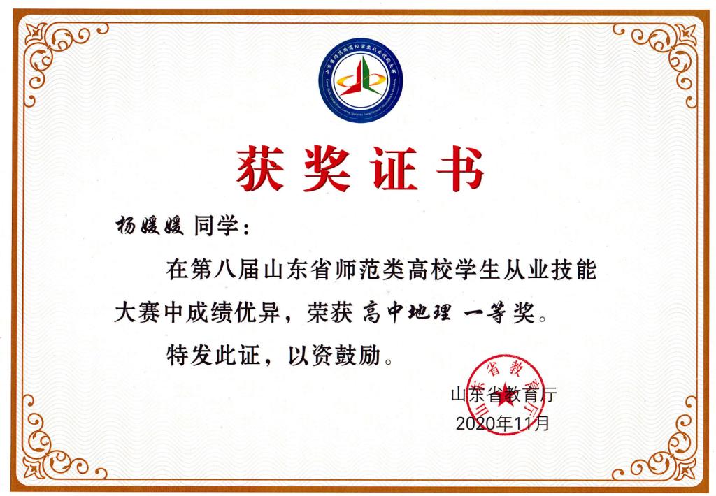 在专业技能方面,第八届山东省师范类高校学生从业技能大赛一等奖,十二届山东省大学生科技节地理教学大赛三等奖,黄金城官网