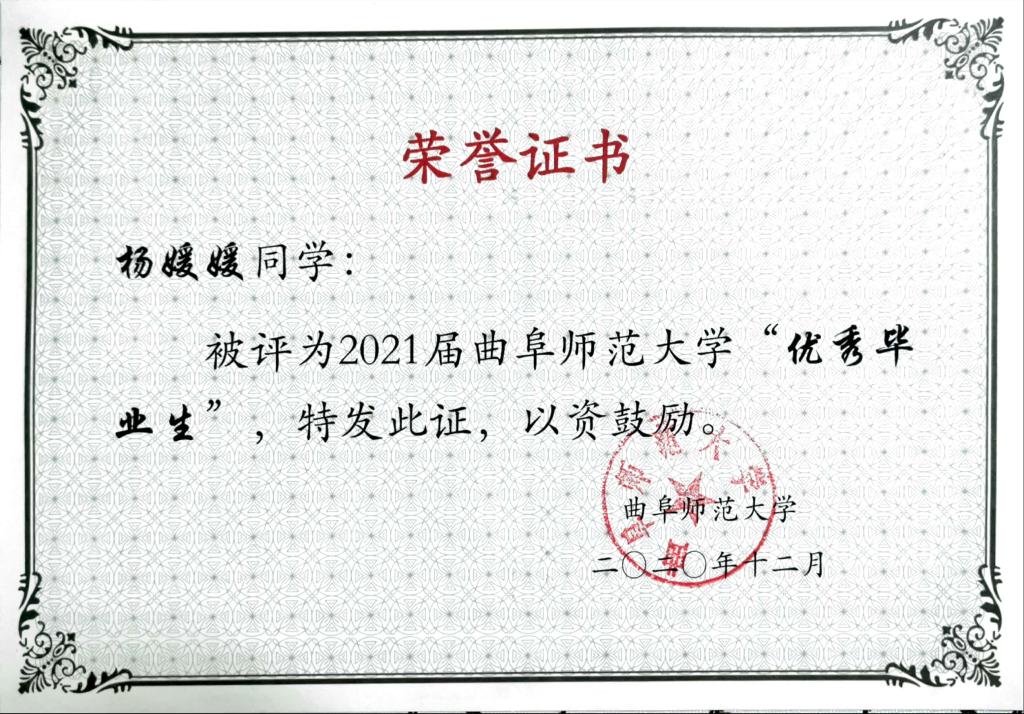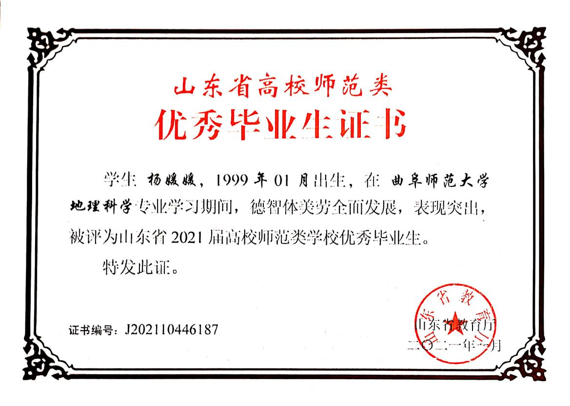在学习方面,2019—2020年度成绩排名专业第一名,并在课余时间通过大学英语四六级、计算机二级、高中地理教师资格证、普通话等级考试等,多次获得奖学金,被评为优秀团员。