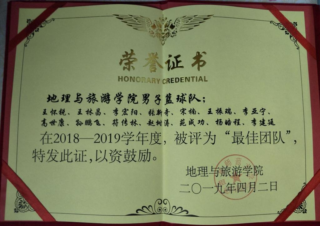 所获奖项:2018—2019年学,所在男子篮球队获得“最佳团体”称号