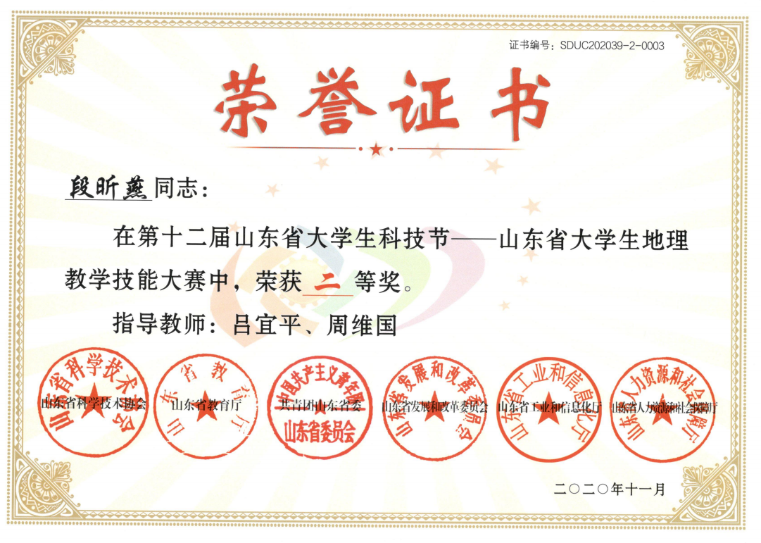 获奖情况:2020年山东省大学生地理教学技能大赛二等奖