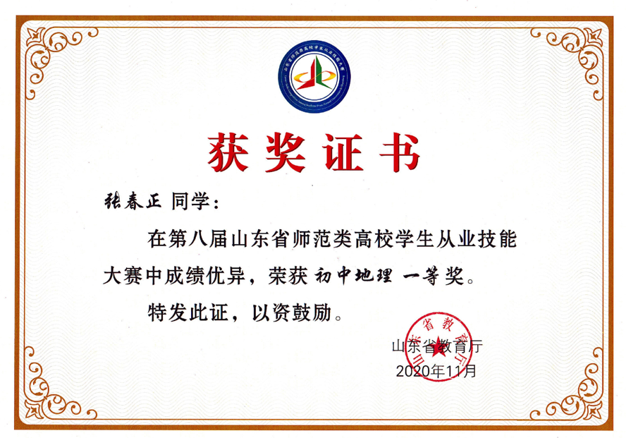 获奖情况:第八届山东省师范类高校学生从业技能大赛初中组地理一等奖