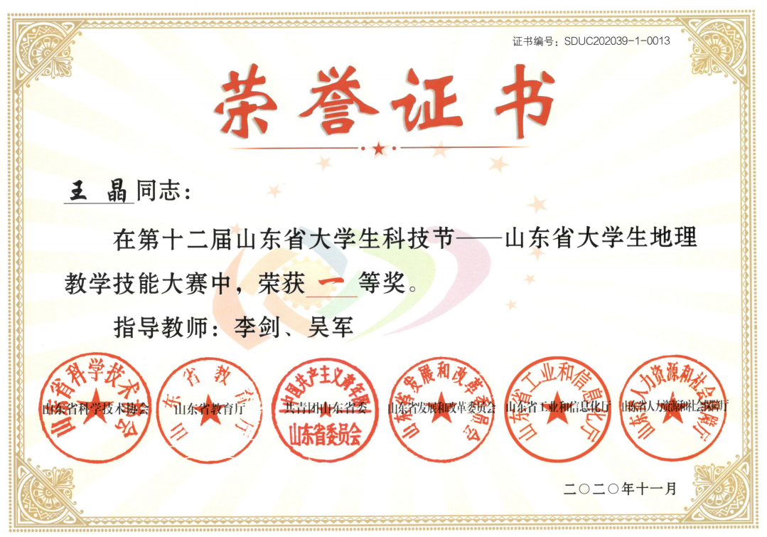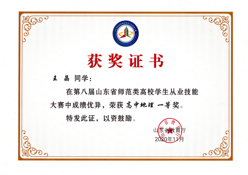 获奖情况:山东省大学生地理教学技能大赛一等奖;第八届山东省师范类高校学生从业技能大赛高中地理一等奖。