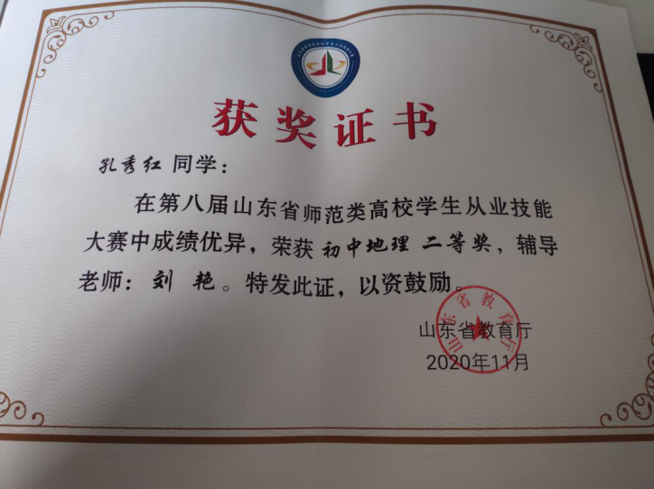 获奖情况:第八届山东省师范类高校学生从业技能大赛初中地理二等奖