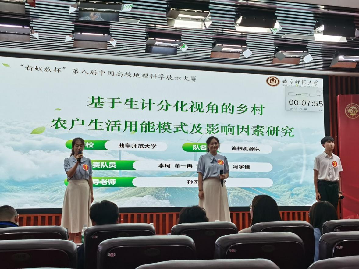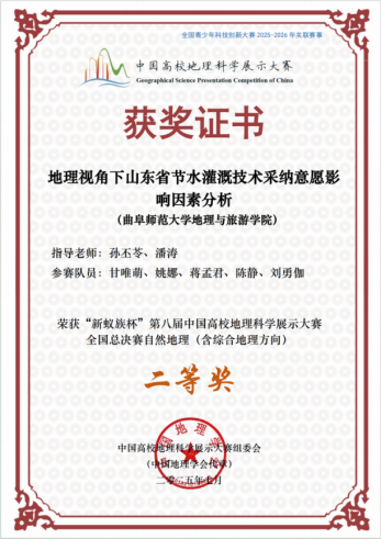 孙丕苓、潘涛老师指导,学生甘唯萌、姚娜、蒋孟君、陈静、刘勇伽完成的作品《地理视角下山东省节水灌溉技术采纳意愿影响因素分析》获得自然地理(含综合地理方向)组二等奖;孙丕苓老师指导,李珂、董一冉、冯宇佳、李冉、李纪琰完成的作品《基于生计分化视角的乡村农户生活用能模式及影响因素研究》获得人文地理组二等奖。李珂、李冉、冯宇佳三位同学作为参赛代表队伍接受央视频的采访,充分彰显了黄金城官网
