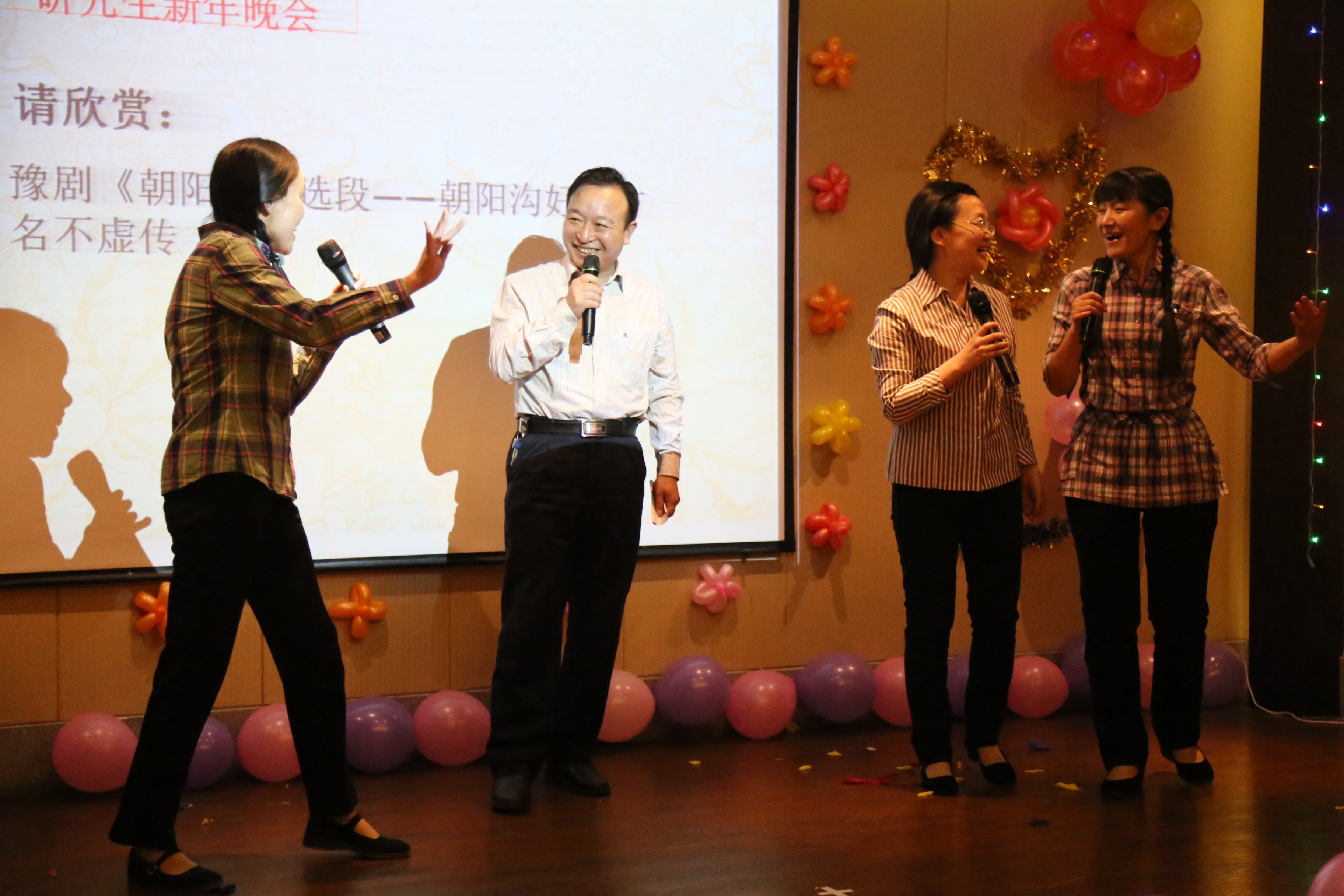 晚会节目形式多样,古今汇聚。动感的开场舞,使得整场晚会热烈起来,同学们的小品《曲园联播》,幽默的讲述了曲园生活的酸甜苦辣,语言凝练幽默不时引爆台下同学的笑点。院领导也纷纷上台,献上节目与师生共享新年祝福,胡书记一首《春江花月夜》带领我们进入唯美的诗歌世界。刘爱东老师与谢院长的一曲《陪你一起看草原》,让我们仿佛来到绿草茵茵、牛羊遍地的大草原。荆老师的一曲《父亲》将对父亲那份浓浓的爱,用歌声表达出来。晚会最大的惊喜应属代院长与几位女老师带来的豫剧《朝阳沟》,他们的表演得到台下阵阵鼓掌声与尖叫声,将整场晚会推上新的高潮。结束总在欢笑后,随着动听的歌曲《明天会更好》研究生新年晚会也接近尾声。