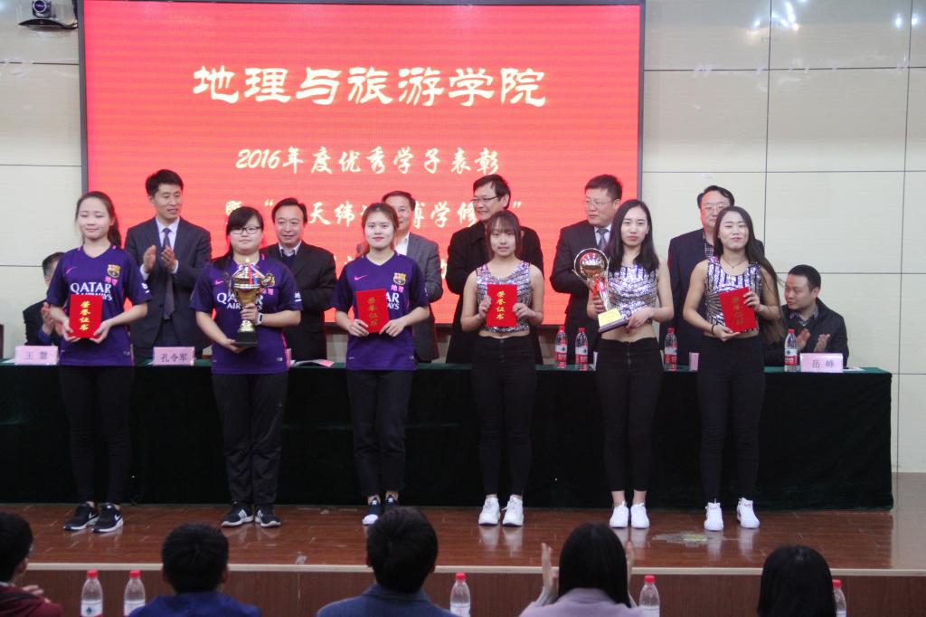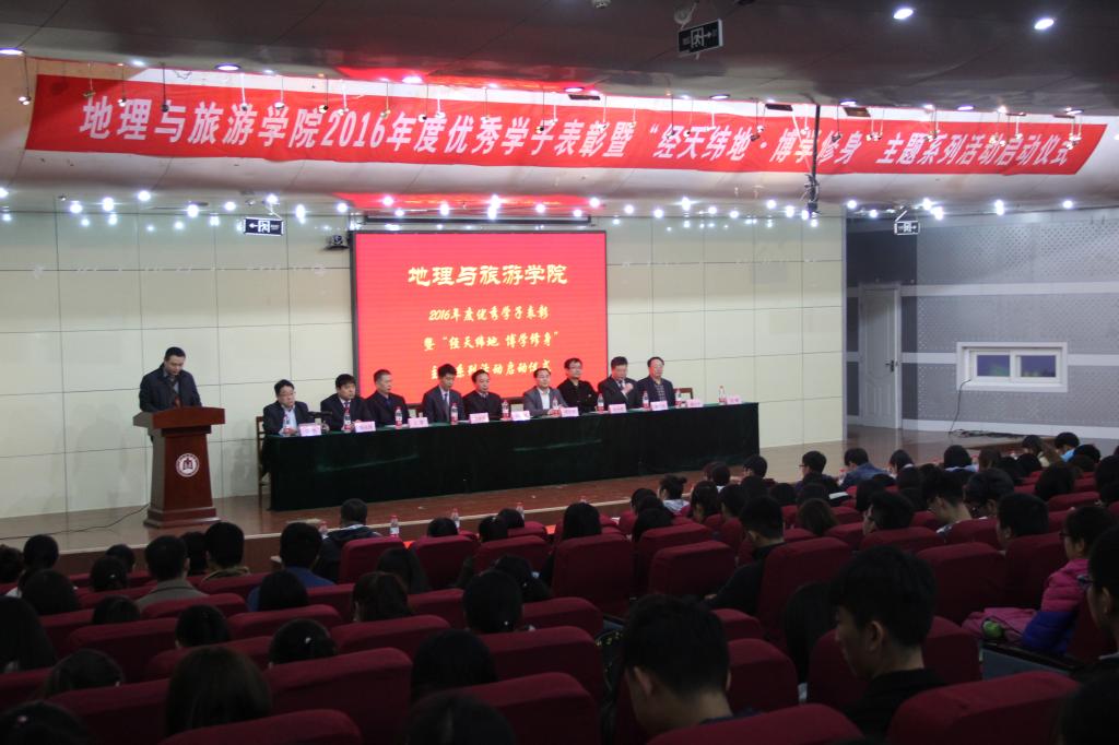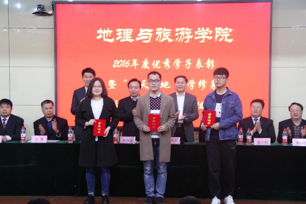团委书记岳峰宣读2016年度优秀学子、科研创新、社会实践获奖名单并由出席活动的领导为其颁奖。优秀毕业生、全国地理教学技能大赛一等奖获得者范梦甜,十佳学子代表王凝恺作为学生优秀代表发言。优秀学子以自身经历为例,从“理想、勤奋、兴趣”三个方面来总结大学的学习生活和课外活动,讲述自己获得的学习竞赛荣誉、科研创新成果以及社会实践生活的努力过程和成长感悟,展现了地理黄金城官网