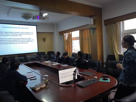 报告会上,齐博士以“基于光谱分析的浮游植物藻华遥感反演与分析”为主题分享了其最新研究成果。报告详细介绍了我国黄海从2008年到2016年间藻华的变化情况,并分析了我国黄海藻华随季节的变化情况;介绍了水色遥感的光学原理,从光谱特征指数的角度分析了藻华的种类,从物理动力学的角度分析了东海藻华的移动情况以及黄海藻华的来源;齐琳博士还提出了关于水色遥感的研究计划。报告结束后,齐琳博士与老师们进行了深入交流,对目前水色遥感、环境遥感等方面的研究进展和热点展开了热烈讨论。此次学术报告不仅带给老师们前沿的学术知识,还进一步让老师们加深了对我国海洋环境监测的认识。