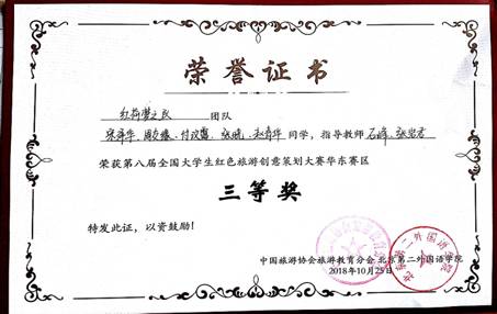 积极组织旅游管理及其相关专业同学组队参赛。毕惠华、杨雪嘉、吉露、蒋韶檀、徐媛媛等同学组成的“雪露韶华”队、宋泽华、周友缘、付文霭、张晓、赵青华等同学组成的“红荷梦之队”分获华东赛区二等奖、三等奖。吴军、石峰和张岩君老师被评为大赛优秀指导教师。