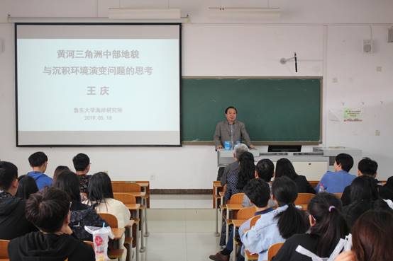 王庆教授以黄河三角洲中部地区形成历程为切入点,从不同方位简述黄河三角洲中部地区的地貌与沉积环境演变过程,引出对该问题的思考,并从不同时空尺度上对黄河三角洲中部的地貌与环境演变过程进行了实证研究和模拟研究结果分析,对黄河三角洲的部分区域如滦河三角洲以及莱州湾东岸的地质地貌特点向在座师生进行了详细的描述,进而结合河流演变历史引导大家推测其他区域的地质地貌演变情况。报告中,他结合不同的研究方法如沉积地貌学、海岸地貌学、气候地貌学和历史地貌学等,同时采用地貌学、沉积学、动力学和年代学相结合的技术路线,对中尺度海岸地貌与环境演变、气候变化、极端动力过程以及相对海面上升等情况对海岸地貌与环境的影响等问题一一发表见解,使老师和同学们对地貌与环境演变的相互关系有了新的认识和更高层次的了解。