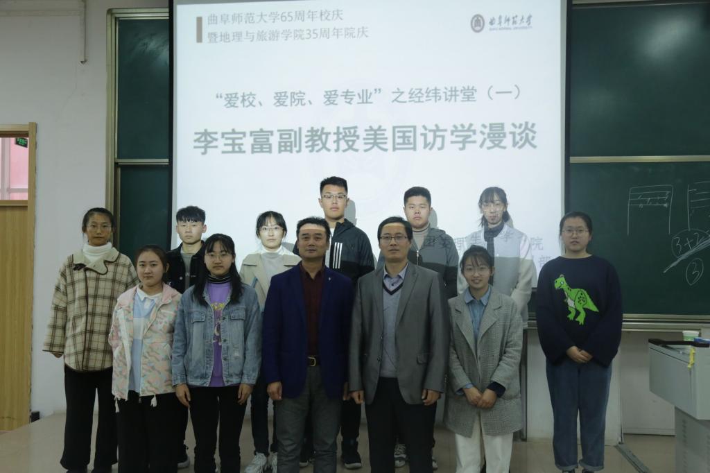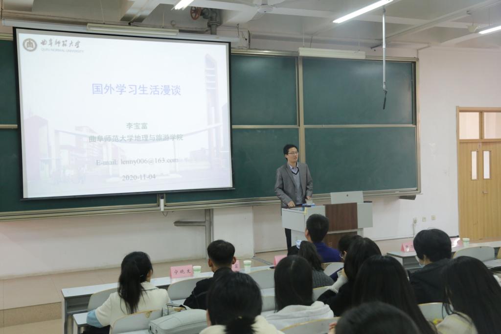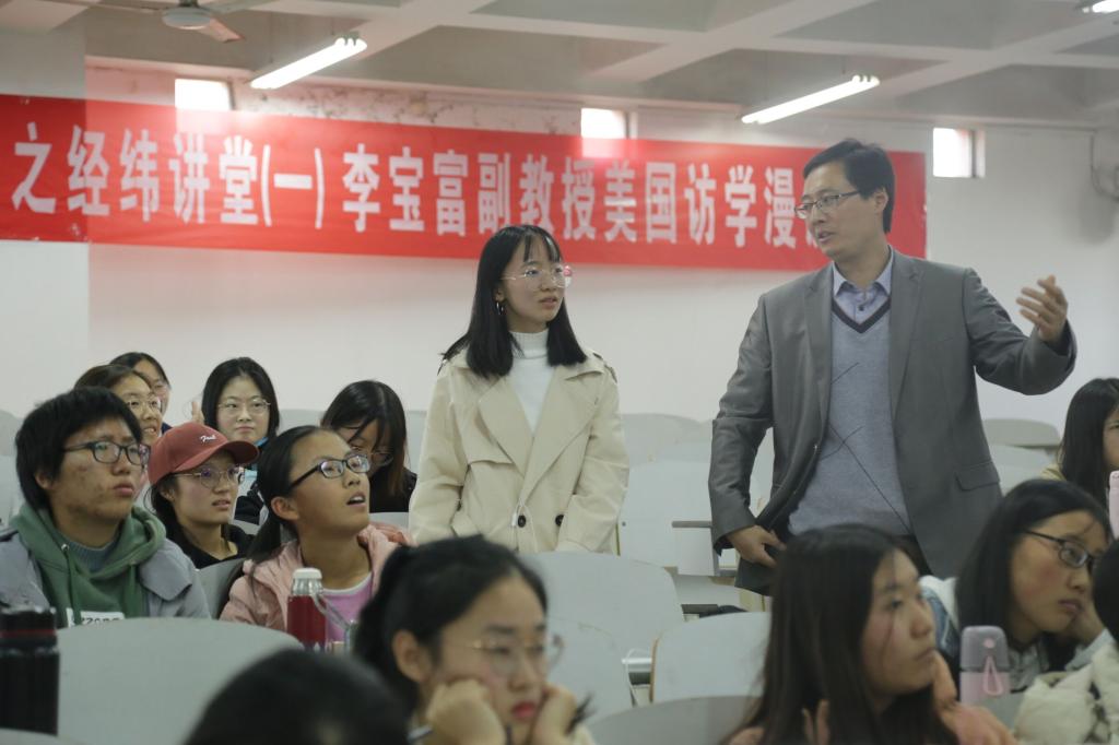 的访学研究和校园生活,展示了不同的人文风情,重点讲述自己对学术的新认识,即研究者在“专、精”的同时也要兼顾“广、博”。最后,李宝富表示,希望自己的讲解能给同学们带来更深远的思想碰撞和智慧启迪。通过讲解,同学们对相关问题产生浓厚的兴趣,李老师结合近期的学术研究与同学们展开学术研讨,同学们积极与老师进行互动讨论。