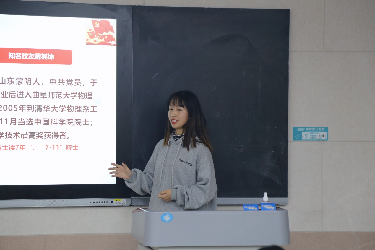 回顾党史,我们发现宝贵历史经验弥足珍贵,回顾校史,我们觉醒优秀模范就在身边。辛媛同志作为本次活动第三部分“党史与校史”的主讲人,为大家讲述了薛其坤院士的优秀事迹,“努力总会有收获,艰苦会带来幸福”是薛其坤在演讲时所说的,只要勤奋,执着,专注就会有收获,天才总是极少数人,薛其坤院士不过是比更多普通人付出了更多的努力,保持对梦想的初心,一步一个脚印地迈,才获得了如此大的成功。