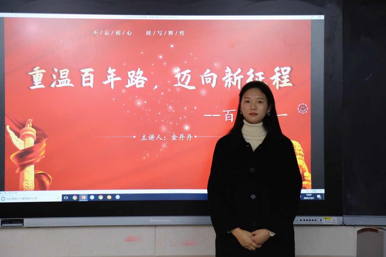 百年来,中国共产党引领人们历经了革命斗争时期、共和国建立时期、改革开放时期以及社会主义新时代,在这其中有许许多多能称得上“第一”的关键性历史瞬间。金丹丹同志作为“百年第一”部分的主讲人,带领大家一同学习了改革开放的相关内容,她讲到改革开放是我们党的一次伟大觉醒,是中国人民和中华民族发展史上一次伟大革命,正是这个伟大觉醒孕育了我们党从理论到实践的伟大创造,正是这个伟大革命推动了中国特色社会主义事业的伟大飞跃。