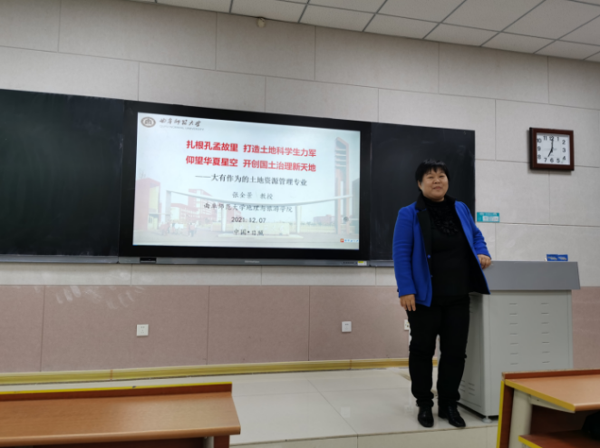 土地资源管理的专业特色、师资力量、科研实力、学业成效。同时,他就土地功能、原生土地问题、次生土地问题、社会土地问题等内容进行详细讲解,阐述了我国土地资源现状,指出土地管理者的责任为发现问题、探究原因、提出对策、化解矛盾、提高土地效益、促进社会和谐发展,激励同学们在认真学习专业知识的同时将专业知识与实践相结合。