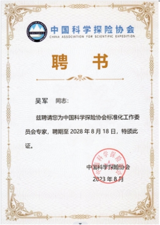 吴军教授获聘中国科学探险协会标准化工作委员会专家。