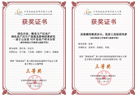 付丰赫、王汉成、吴敏轩、岳晓雪、邱筱涵的参赛作品《粮食主产区农户绿色农产品生产意愿及影响因素研究—基于山东省428份农户样本分析》荣获三等奖;张欣萍、张晓忆、李丽的参赛作品《治纵横沟壑黄沙天,筑黄土高原清风梦》荣获三等奖。