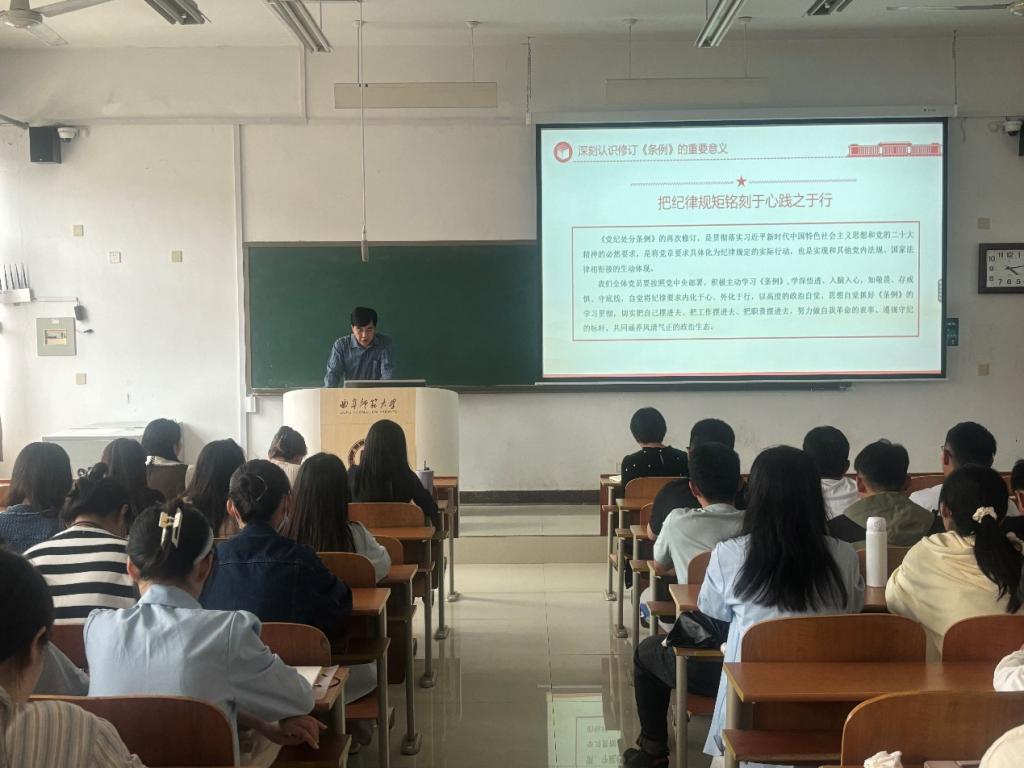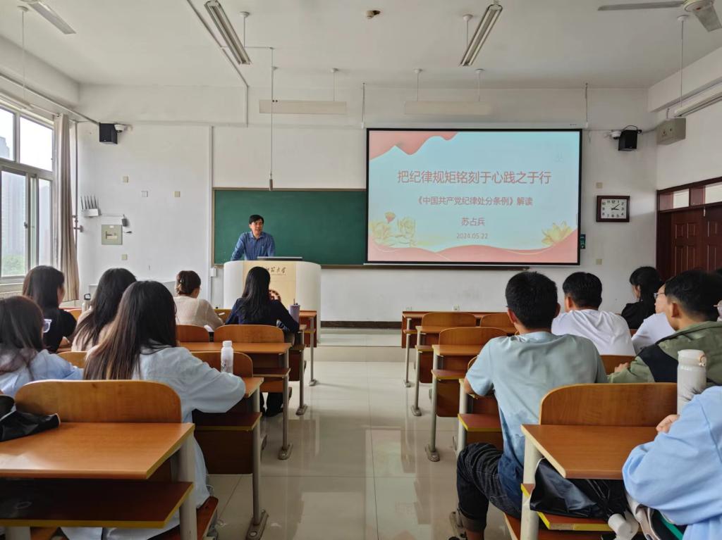 党委书记苏占兵为全体研究生党员和入党积极分子讲授了“把纪律规矩铭刻于心践之于行”党纪学习教育专题党课。