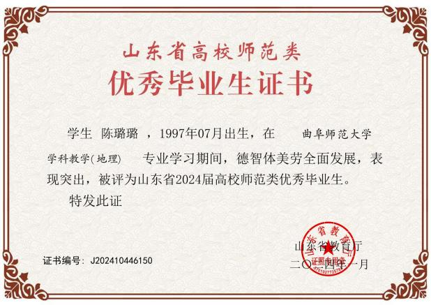 在科研方面,3位同学在《Land》《天津师范大学学报》等核心期刊发表论文,15位同学在《地理教育》《地理教学》《中学地理教学参考》《教学与管理》等地理教育专业期刊发表论文23篇。1位同学获得国家奖学金,3位同学被评为山东省2024届高校师范类优秀毕业生;2022年度,9位同学被评为黄金城官网