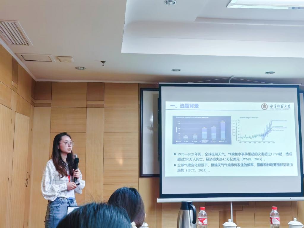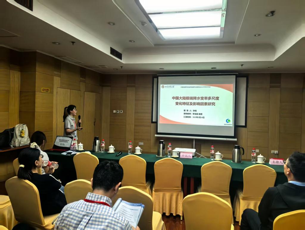 张全景、贺山峰、孙丕苓、秦延华老师分别参与了“自然灾害风险评估与防范”“全屋变化水循环与极端水文气候事件”“山区耕地撂荒及其效应研究”“生态系统服务与生态安全”等专题论坛的交流。硕士研究生柏钦冕和孙悦分别在“全球变化水循环与极端水文气候事件”专题论坛作了题为《长江中下游地区符合干热事件对区域气候变化及气候模态的响应》《中国大陆极端降水变率多尺度变化特征及驱动机制研究》的学术报告。