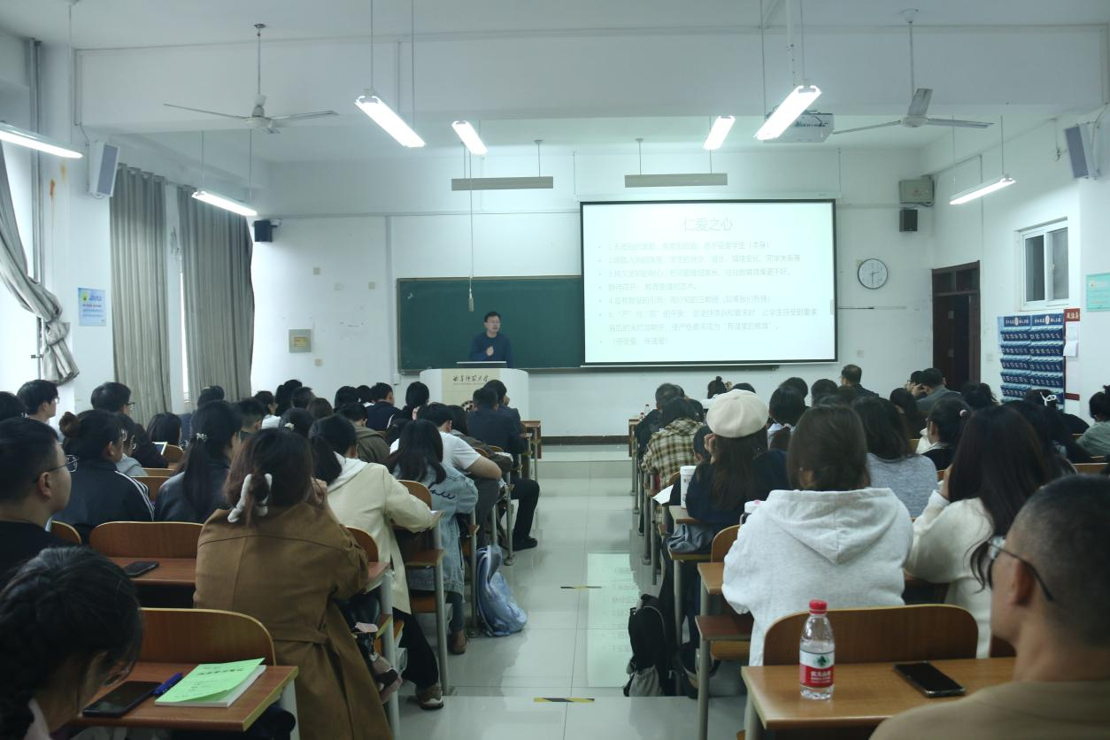 舒德全老师从“我是一名好老师吗?”“什么样的老师是好老师?”“如何成为一名好老师?”“教师成长的几点感想”四个方面入手,引导同学们应增加对教师的职业认同,把教师职业当成事业,把平凡做成经典;鼓励各位同学要做有理想信念、有道德情操、有扎实学识、有仁爱之心的四有好老师;强调教育理论对教学实践的重要指导意义,帮助同学们为接下来的就业做好准备。