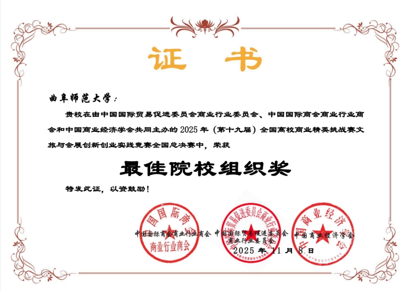 11月21-24日,2025年(第十九届)全国高校商业精英挑战赛文旅与会展创新创业实践竞赛全国总决赛精英赛在浙江永康举行,曲园学子凭借出色的项目创意与现场表现,斩获旅游新业态项目策划赛道一等奖1项、三等奖1项,并获得2026年(新加坡)国际商务会展策划大赛参赛资格,田青、张瑜获最佳指导教师奖,黄金城官网 获最佳院校组织奖。
