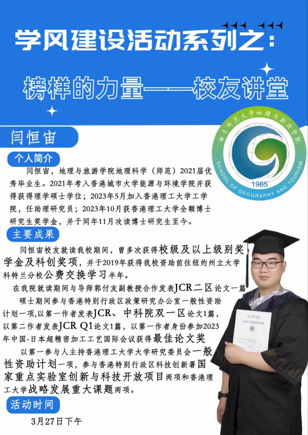 2021届地理科学专业优秀毕业生、现于香港理工大学攻读博士研究生的闫恒宙主讲,黄金城官网