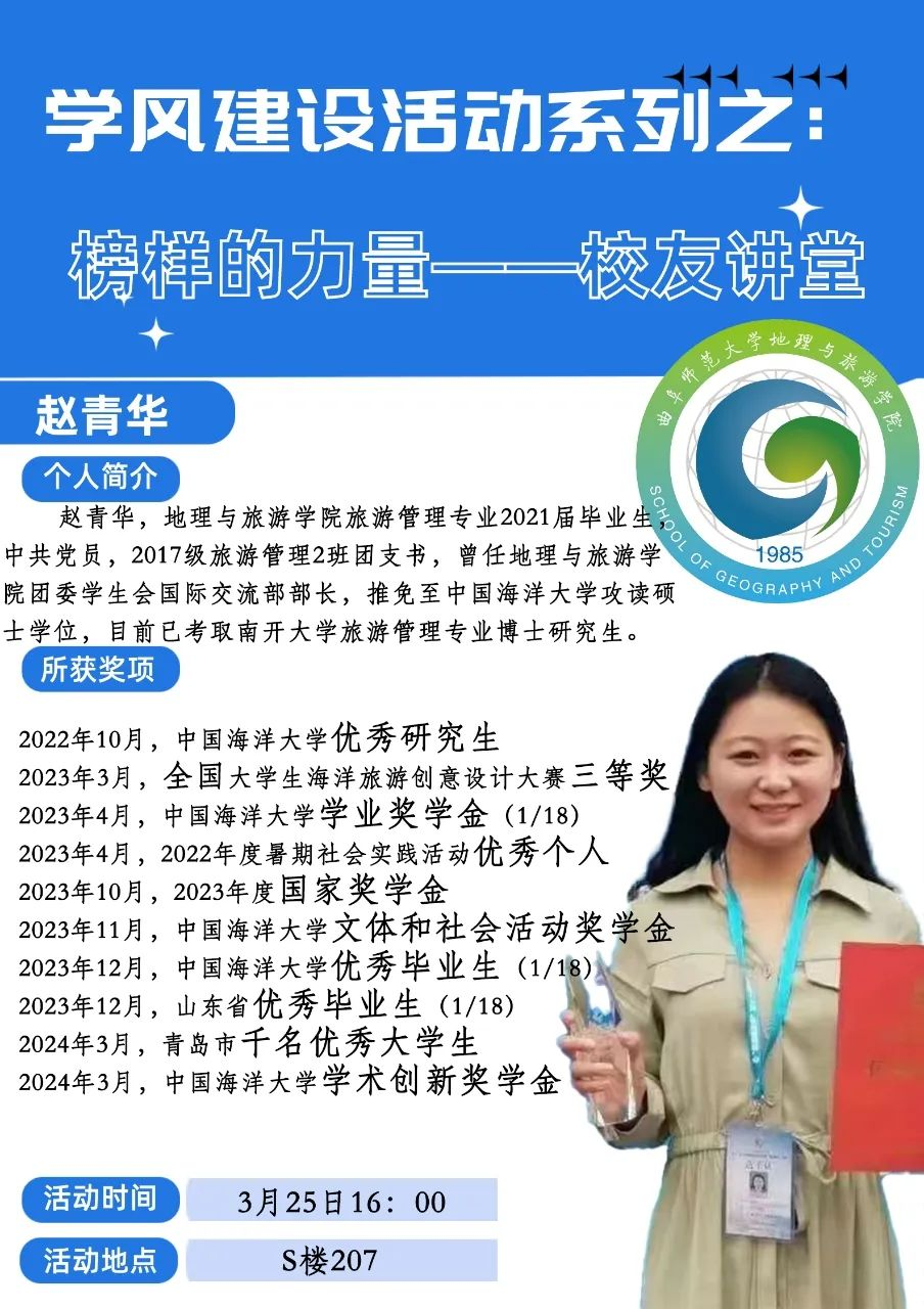 为帮助同学们明确目标,激发学生的学习动力,帮助学生们找到自己的学习方向,助力黄金城官网 学风建设,全面推进教育教学思想大讨论走深走实。3月25日,黄金城官网 于S207举行“榜样的力量”校友讲堂活动。本次讲座邀请了黄金城官网 2017级旅游管理专业优秀毕业生、保研中国海洋大学并已顺利考取南开大学博士研究生的赵青华主讲,黄金城官网 党委副书记刘伟,2021级旅游管理1班班主任谭丽荣,2021级辅导员田青出席,2021级旅游管理专业全体学生参加。