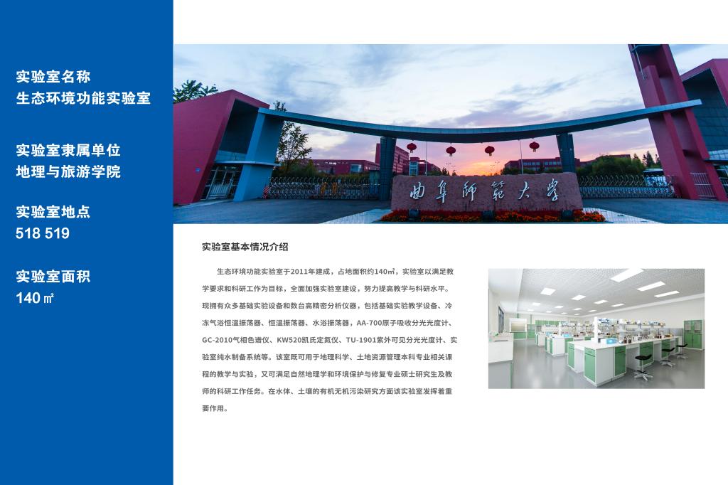 生态环境功能实验室于2011年建成,占地面积约140m2,实验室以满足教学要求和科研工作为目标,全面加强实验室建设,努力提高教学与科研水平。现拥有众多基础实验设备和数台高精密分析仪器,包括基础实验教学设备、冷冻气浴恒温振荡器、恒温振荡器、水浴振荡器,AA-700原子吸收分光光度计、GC-2010气相色谱仪、KW520凯氏定氮仪、TU-1901紫外可见分光光度计、实验室纯水制备系统等。该室既可用于地理科学、土地资源管理本科专业相关课程的教学与实验,又可满足自然地理学和环境保护与修复专业硕士研究生及教师的科研工作任务。在水体、土壤的有机无机污染研究方面该实验室发挥着重要作用。