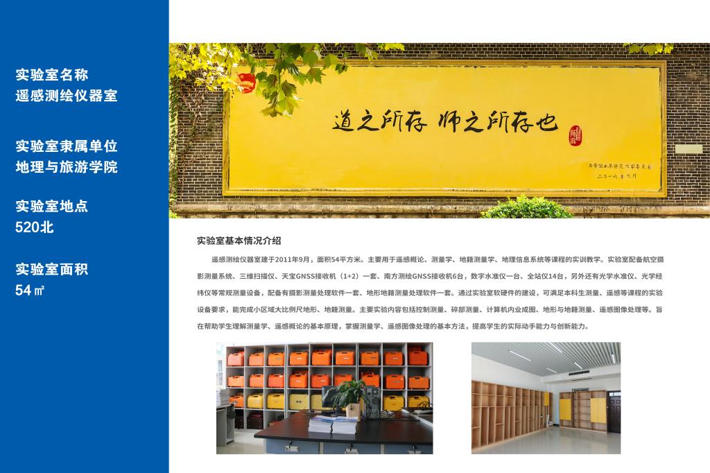 遥感与地理信息系统功能实验室建于2011年9月,面积54平方米。主要用于遥感概论、测量学、地籍测量学、地理信息系统等课程的实训教学。实验室配备航空摄影测量系统、三维扫描仪、天宝GNSS接收机(1+2)一套、南方测绘GNSS接收机6台,数字水准仪一台、全站仪14台,另外还有光学水准仪、光学经纬仪等常规测量设备,配备有摄影测量处理软件一套、地形地籍测量处理软件一套。通过实验室软硬件的建设,可满足本科生测量、遥感等课程的实验设备要求,能完成小区域大比例尺地形、地籍测量。主要实验内容包括控制测量、碎部测量、计算机内业成图、地形与地籍测量、遥感图像处理等。旨在帮助学生理解测量学、遥感概论的基本原理,掌握测量学、遥感图像处理的基本方法,提高学生的实际动手能力与创新能力。
